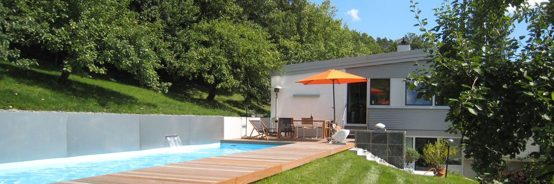 Wohlfühlen durch sportliche Aktivität: Die körperliche Fitness steht im Vordergrund und wird zum Hauptthema des Gartens. Ein natürlich gestalteter Schwimmteich oder ein architektonisch gebauter Naturpool bieten ideale Möglichkeiten zur vielfältigen sportlichen Betätigung. Für ungetrübte, natürliche Abkühlung nach dem Saunagang sorgt ein geringer bemessenes Tauchbecken, gewissermaßen ein Teich in Miniformat. Er findet auch in kleinen Gärten Platz. Eine technisch ausgereifte, mechanische Wasserreinhaltung ersetzt chemische Zusätze und gestaltet das Naturerlebnis intensiver und umweltfreundlicher. Darüber hinaus bieten besondere Rückzugsorte den passenden Rahmen für Gymnastik-Übungen unter freiem Himmel – etwa auf einem Rasenstück oder dem Holzdeck am Ufer. Landschaftsarchitektinnen und Landschaftsarchitekten wissen, wie Geborgenheit zu inszenieren ist. So kann die Bauherrschaft ihr persönliches Refugium etwa in einer eingewachsenen Sitzecke mit duftenden Kräutern finden.