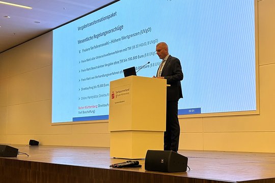 Mit rund 600 Teilnehmenden hatte der diesjährige Vergabetag am 24. Januar durchschlagende Resonanz. „Wir haben ein volles Haus! Das zeigt, wie brisant die Themen rund um die Vergabe sind“, so Bernd Düsterdiek, Referatsleiter Dezernat Städtebau, Vergaberecht und Umwelt beim Deutschen Städte- und Gemeindebund. Die Architektenkammer Baden-Württemberg ist seit vielen Jahren Partnerin dieses beachteten Forums für Architektinnen und Architekten, Ingenieure, Planende und Praktiker aus den öffentlichen Vergabestellen. Bei der 23. Auflage in der Stuttgarter Sparkassenakademie coverte nahezu ein Dutzend Rednerinnen und Redner unterschiedlichste Aspekte.