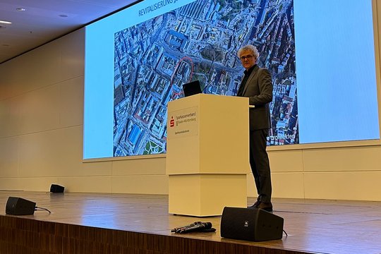 Gerd Grohe, Geschäftsführer Kohler Grohe Architekten und Vorsitzender des AKBW-Kompetenzteams Verfahren, stellte leidenschaftlich die Vorzüge und Chancen eines interdisziplinären Wettbewerbs im Bereich des Bestandsbaus dar. Dieser eigne sich für Bauaufgaben aller Größen. Seine These belegte er mit einem konkreten Beispielfall, den sein Büro als Wettbewerbsbetreuer begleitete: der nicht offene, 2-stufige Realisierungswettbewerb für den Bestandskomplex Königstraße 1a/b in Stuttgart. „Jede Aufgabe ist individuell und erfordert ein individuelles Verfahren“, so Grohe. Gerade im Bestand sei oft nur ein interdisziplinäres Team in der Lage, die sich stellenden Aufgaben, etwa zu niedrige Raumhöhen für Bürogebäude, zu lösen. Deshalb werde in solchen Wettbewerben häufig Neuland betreten. Grohes Überzeugung: „Der Wettbewerb ist ein Innovationsmotor!“