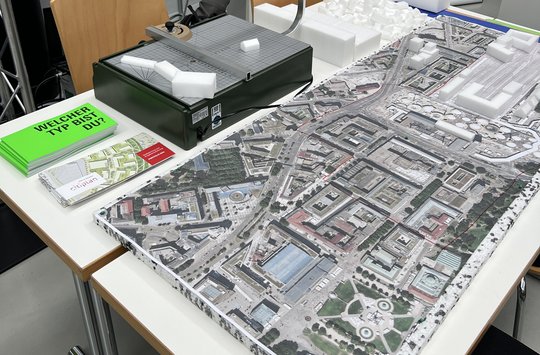 Ein Magnet war das von den Stadtplanerinnen Mirja Roggenstein und Tonja Herl (SiP) mitgebrachte Luftbild des Stuttgart21-Areals, wo sich Interessierte mit Styrodur und Styrocutter an der (Um-)Gestaltung des Quartiers versuchten. Kommentar einer Schülerin, die ein Firmengebäude einfügte: „Das geht doch ganz fix, ich weiß nicht, warum die so ewig brauchen.“