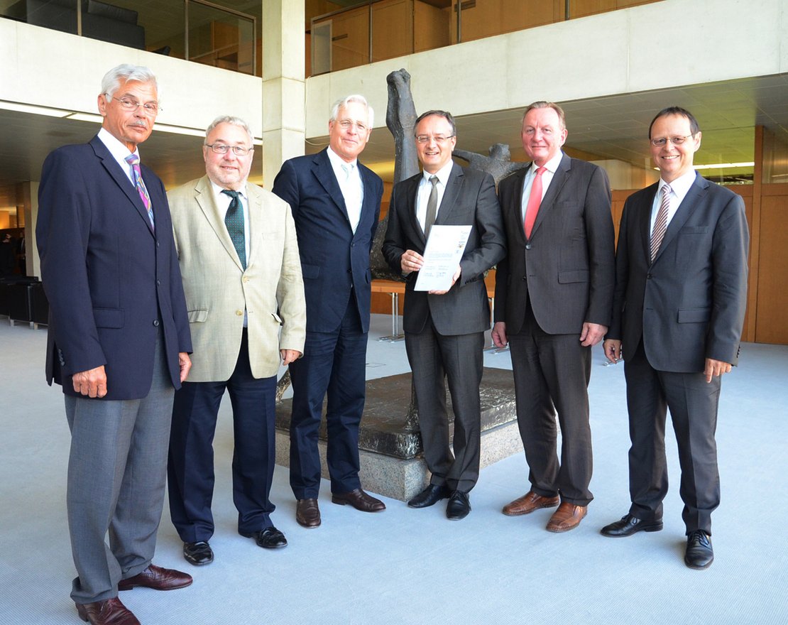 Übergabe im Landtag von Baden-Württemberg, Juli 2013: Kultusminister Andreas Stoch MdL (SPD) mit dem Positionspapier. Zu seiner Linken SPD-Fraktionsvorsitzender Claus Schmiedel MdL sowie Hans Dieterle, Hauptgeschäftsführer der Architektenkammer Baden-Württemberg. Zu seiner Rechten Dr. Albrecht Rittmann, Vorsitzender des Ausschusses für Städtebau und Denkmalpflege, Schwäbischer Heimatbund, Prof. Dr. Rainer Prewo, Vorstandsvorsitzender der Denkmalstiftung Baden-Württemberg sowie Fritz-Eberhard Griesinger, Vorsitzender des Schwäbischen Heimatbunds