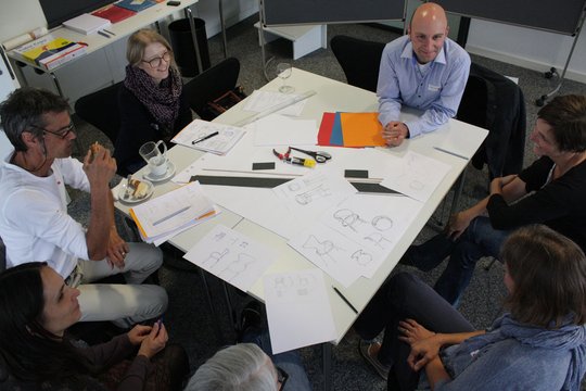 Begleitet von Bildern aus der jeweiligen Gruppenarbeit fassten die drei Workshop-Leiter die Inhalte und Ergebnisse ihres Nachmittags im Abschlussplenum zusammen. Es folgte ein angeregterAustausch rund ums Thema Architekturvermittlung. Dabei wurde auch der Ruf nach mehr Anerkennung für diese wichtige Bildungstätigkeit laut: Auf rein ehrenamtlicher Basis könnten Architektinnen und Architekten die anspruchsvolle Arbeit nicht erbringen; darüber hinaus regten die Teilnehmer an, dass die Kammer für den Besuch der "Architektur macht Schule"-Veranstaltung anerkannte Fortbildungsstunden vergeben solle.