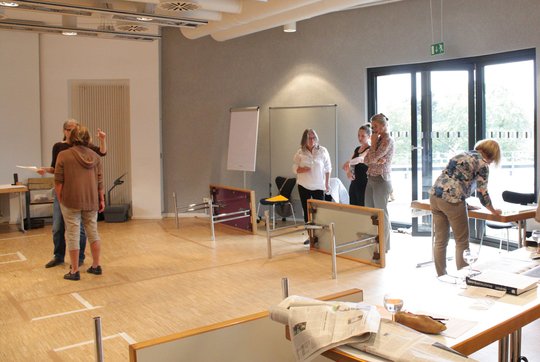 Wie viel Fläche der minimierte Grundriss des sozialen Wohnungsbaus konkret vorsah und welche Raumansprüche heutzutage Standard sind, war die Fragestellung des dritten Workshops. Dr. Dr. Arne Winkelmann ließ die Anwesenden mit einfachen Übungen und Versuchen das Thema praktisch aufarbeiten. Dazu gehörte, mit dem eigenen Körper die Fläche für eine bestimmte Nutzung zu ermitteln und auch die mögliche Möblierung anhand von Platzhaltern zu überlegen.