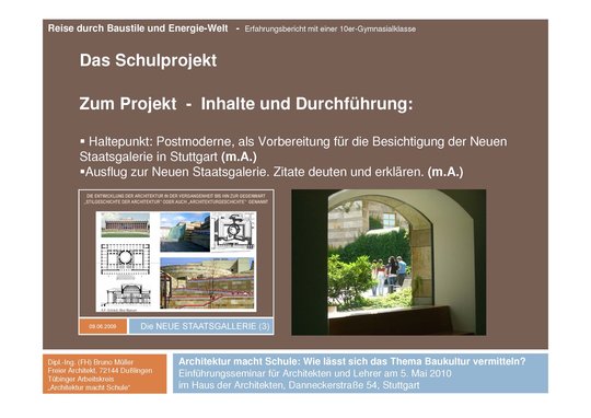 Wache Blicke und auch Widerstand hätte es erst bei Stichworten wie politischer Missbrauch von Architektur gegeben oder der Behauptung Automuseen seien die neuen Sakralbauten der Gegenwart. "Das regte und erregte die Gemüter. Da wurde es hautnah und greifbar." Müllers Fazit: ein Projekt mit Schülern will gut vorbereitet und mit persönlicher Begeisterung angegangen sein. Vernünftig findet er es deshalb, das eigene Lieblingsthema in verschiedenen Varianten – theoretisch, praktisch, an verschiedene Altersstufen angepasst – auszuarbeiten und aktiv anzubieten.