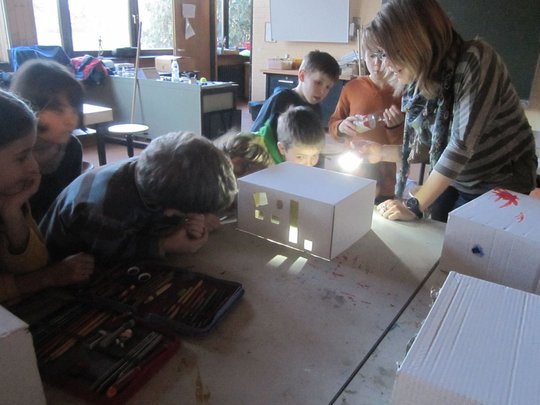 In verschiedenen gleich großen Kartons haben wir in kleinen Gruppen ausprobiert, was es heißt, ihn zu belichten und zu beleuchten - auf natürliche Art und Weise: wir haben Fenster eingebaut. Dann haben wir versucht unsere Wohnung, in der wir uns Tag täglich aufhalten, auf ein Stück Papier zu malen. Puh! Das war schwer. Wir kennen jeden Winkel und wissen genau wo welcher Schrank steht und dass die Tür nicht am Bett anstößt und dass eigentlich noch ganz schön viel Wand zwischen den beiden anderen Wänden sein müsste, aber so aus dem Kopf ... So machten wir es uns zur Aufgabe, bis zum nächsten Treffen unser Kinderzimmer auszumessen.