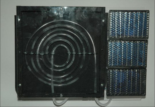 Den Fertigbausatz habe ich von „Winkler Schulbedarf“ bezogen. Aus der Produktbeschreibung: „Faszinierende Anwendung der Sonnenenergie! Ein absolut funktionstüchtiger Sonnenkollektor mit Plexiglasabdeckung, der Wasser in einem Gefäß in ca. 1 Stunde durch Sonnenenergie auf mehr als 70 °C erhitzten kann. Der Motor der elektrischen Kreiselpumpe wird dabei von 3 Solarzellen angetrieben.“