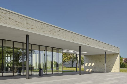 Das Gebäude der Gemeindehalle wirkt wie der Schlußstein des großen Schulcampus. Über seinen Vorplatz leistet es die Anbindung des angrenzenden Gewerbegebiets und verbindet über das neue Fußwegenetz auch durch hybride dörfliche Strukturen hindurch mit dem Ortszentrum. Die ruhige, hochwertige Gestalt des Gebäudes gibt dem diffusen Quartier räumlichen Halt, verleiht ihm ein Gesicht und eröffnet mit seiner torartigen aber unprätentiösen Geste neue kurze Wege. Die großzügigen Freiflächen von Vorplatz, Freiraumtribüne und Retentionsflächen stellen das Gebäude gegenüber der Nachbarschaft genügend frei, um es als öffentliches Haus städtischer Angebote und Kultur wahrnehmbar zu machen.