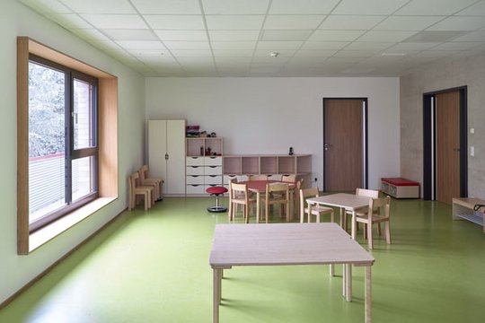 Eine zurückhaltende, fast schon in sich gekehrte Anmutung entfaltet das Äußere des dreigeschossigen Kindergartens, der sich durch seine Kubatur, Aufnahme der Straßenfluchten und helle Steinfassade unaufgeregt in das Umfeld einfügt. Städtebaulich überzeugt die Setzung auf dem schmal zugeschnittenen Grundstück, da die zur Verfügung stehende Fläche effizient genutzt und schlüssig zwischen Straßen- und Parkseite – mit den Außenspielflächen des Kindergartens im hinteren Grundstücksteil – vermittelt wird. Im Innern finden sich für den Alltag der vier Kindergartengruppen helle und spannungsreiche Aussichten bietende Räume. Insgesamt ein gelungenes Beispiel für die Realisierung eines mehrgeschossigen Kindergartens in innerstädtischer Lage.