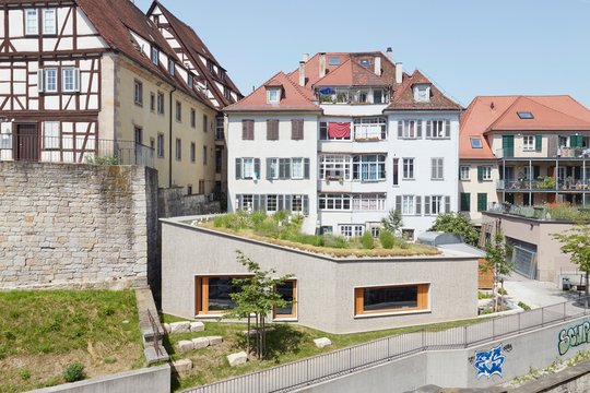Das Projekt agiert in einem historisch und topographisch komplexen Gefüge und behandelt auf vorbildhafte Weise das hochaktuelle Thema der innerstädtischen Verdichtung. Durch den modernen eingeschossigen Anbau an ein spätklassizistisches Wohn- und Geschäftshaus in der Tübinger Altstadt gelingt eine städtebauliche und kompositorische Wiedereinfügung einer zuvor untergenutzten Fläche in die Stadtstruktur. Mit einer sorgfältigen Bepflanzung des Innenhofes und einer intensiven Dachbegrünung erfolgt nicht nur eine ökologische Aufwertung, sondern auch eine beispielhafte Verzahnung von privatem und öffentlichem Raum als Baustein zur Attraktivierung eines neu geschaffenen öffentlichen Fußweges. Die mit dem Projekt erfolgte zeitgemäße Interpretation der räumlichen Nähe von Wohn- und Gewerbenutzung erlaubt kurze Wege zu bereits vorhandener Infrastruktur und Einrichtungen der Daseinsvorsorge. Durch die hochwertige Baukultur und die sensible Reaktion auf die vorgegebene Topographie ist ein neuer attraktiver Ort mitten in Tübingen entstanden. Das Projekt ist aus Sicht der Jury ein gelungenes kleinräumiges Beispiel für eine intensive Flächennutzung.