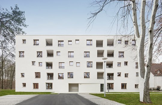 Der Sonderpreis "Kostengünstiger, energieeffizienter Geschosswohnungsbau" ging dieses Jahr an Braunger Wörtz Architekten aus Ulm mit einem weiteren hochwertigen Gebäude der Neu-Ulmer Wohnungsbaugesellschaft (NUWOG). Der Neubau von 31 öffentlich geförderten, barrierefreien Mietwohnungen in einem 6-geschossigen Baukörper ist als KfW-Effizienzhaus 70 konzipiert. Alle Wohnungen sind mit Loggien ausgestattet und mit Holzfenstern und -böden komplettiert. Es gelang den Architekten sehr gut, den kubischen, mit niedrigen Baukosten erstellten Baukörper in den leichten Hang neben den historischen Befestigungsanlagen aus dem 19. Jahrhundert einzufügen. Die unkomplizierte Ausführung mit monolithischen Ziegelaußenwänden, die mit einem Weißzement-Kratzputz, der keinen Anstrich benötigt, versehen sind, gewährleistet diesem Wohngebäude ein wartungsarmes, langes Leben.