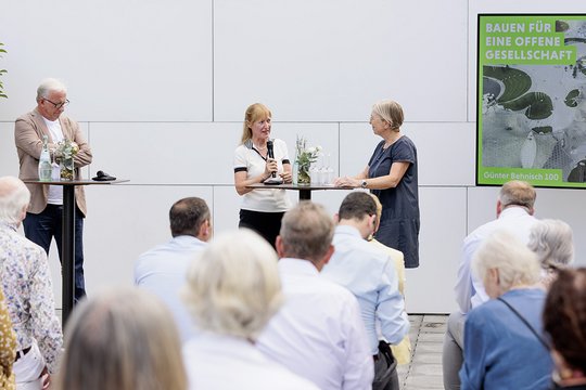 Darauf hob auch Nicole Razavi, die Ministerin für Landesentwicklung und Wohnen, in ihrem Grußwort ab. Dessen Werk zeichne sich aus durch die gelebte Überzeugung, dass nur mit fachübergreifender, gemeinschaftlicher Arbeit Antworten gefunden werden können, und, dass Gestaltung mehr sein müsse als zeitlich vergängliche Mode, sondern in Auseinandersetzung mit dem Ort und dem Kontext stattzufinden habe. „Ich freue mich sehr, dass die Architektenkammer Baden-Württemberg, das saai am KIT und Behnisch Architekten eine Plattform für Günter Behnischs baukulturelles Werk geschaffen hat. Das ist auch eine Art Probelauf für ein Zentrum Baukultur Baden-Württemberg, das an dieser Adresse möglich werden könnte. Lassen Sie uns über ein solches Zentrum gern weiter im Gespräch bleiben und alles dafür tun, dass ein solches Schaufenster für die Geschichte und Innovationen des Planens und Bauens in Baden-Württemberg, aber auch als Diskussionsforum für Baukultur im Land, entstehen kann“, so Ministerin Razavi.