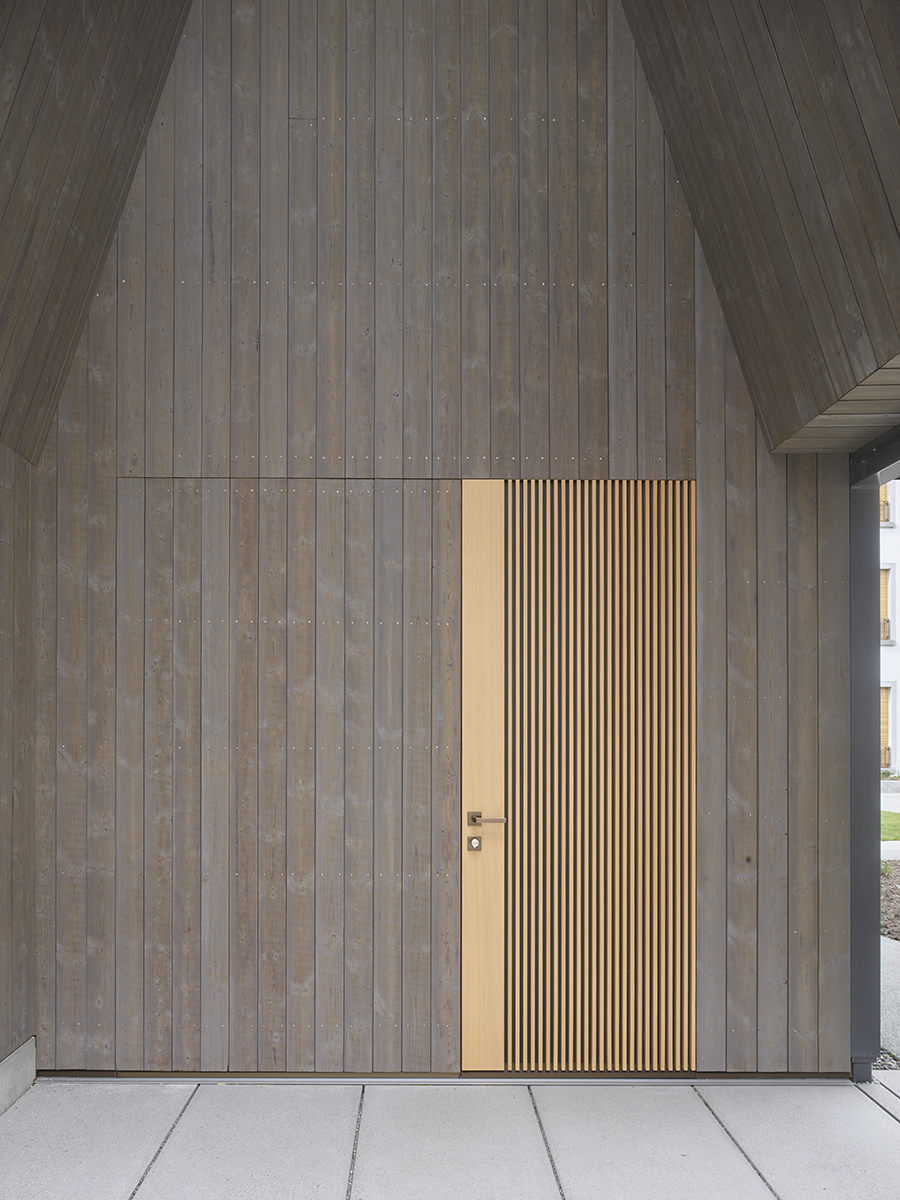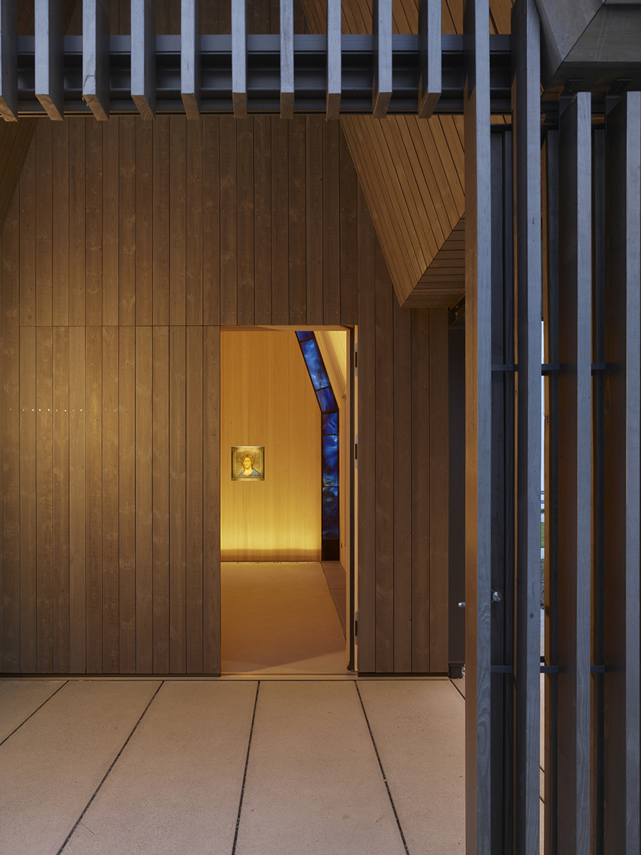 Der Baukörper der Kapelle wird durch ein Lichtband an der Längsseite gegliedert. Aufgesetzte Holzlisenen im Außen- und im Innenbereich verbinden die beiden Baukörper. Die genannten Lisenen verhindern den direkten Einblick in die Kapelle, bei gleichzeitiger großzügiger Belichtung des Kapellenraumes und unterstützen das skulpturale Erscheinungsbild.