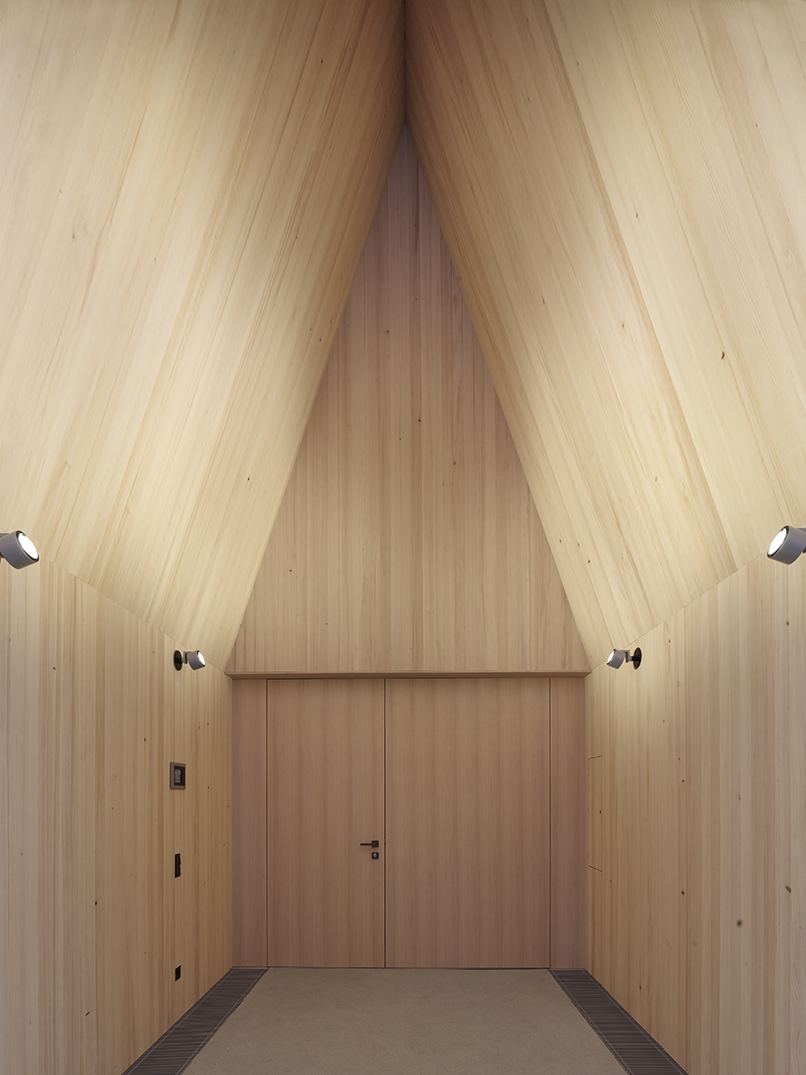 Der introvertierte Kapellenraum ist durch eine Vertäfelung aus gebürsteter Weißtanne sowie direkten und indirekten Belichtungselementen an Giebel und Seitenwänden von aufnehmender Freundlichkeit. Die besondere Dachform wirkt einerseits beschützend, andererseits befreiend. Die ohnehin ausdruckstarke Vertikalität wird durch blaue mundgeblasene Scheiben, welche die Gebäudeform nachzeichnen, verstärkt. Die Farbe Blau deuten wir als Farbe des Göttlichen, des Himmels, des Geistigen, unendlicher Weite, aber auch als Farbe für Introvertiertheit und Rückzug in sich selbst.