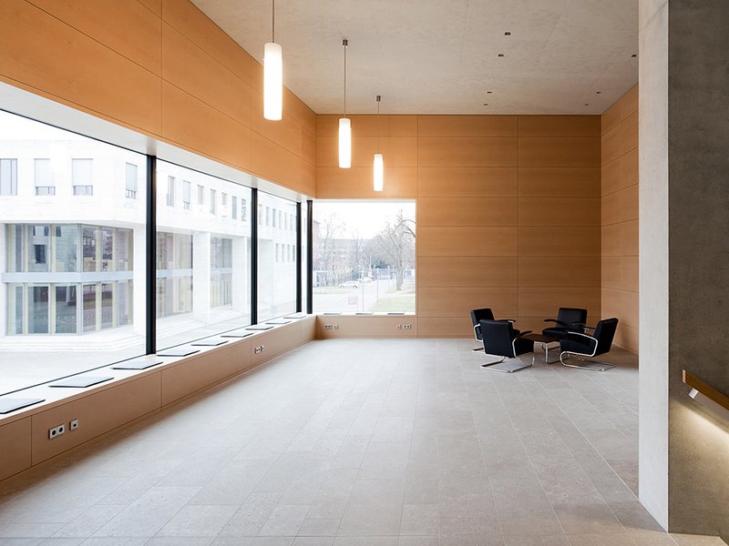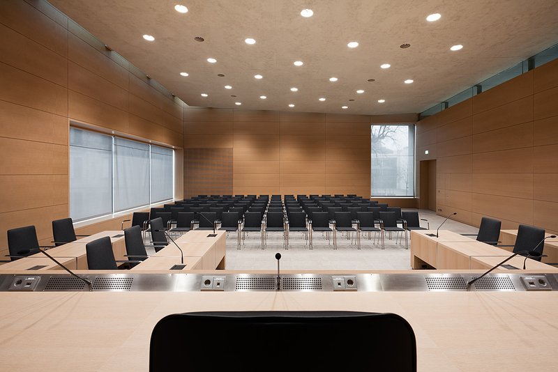 Die Fensteröffnungen im 1. Obergeschoss des Gerichtssaales setzen gezielte Außenbezüge in den öffentlichen Raum und in den attraktiven Innenhof des BGH. Das Dachoberlicht ist ringsum wandbegleitend. Somit setzt sich die Decke im Sitzungssaal von den Außenwänden ab und lässt sie schweben. Zenitlicht streift die holzverkleideten Wände des großen Gerichtssaales, unterstreicht die leichte "Faltung" der Innenhülle.