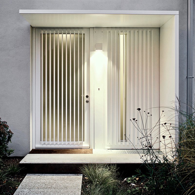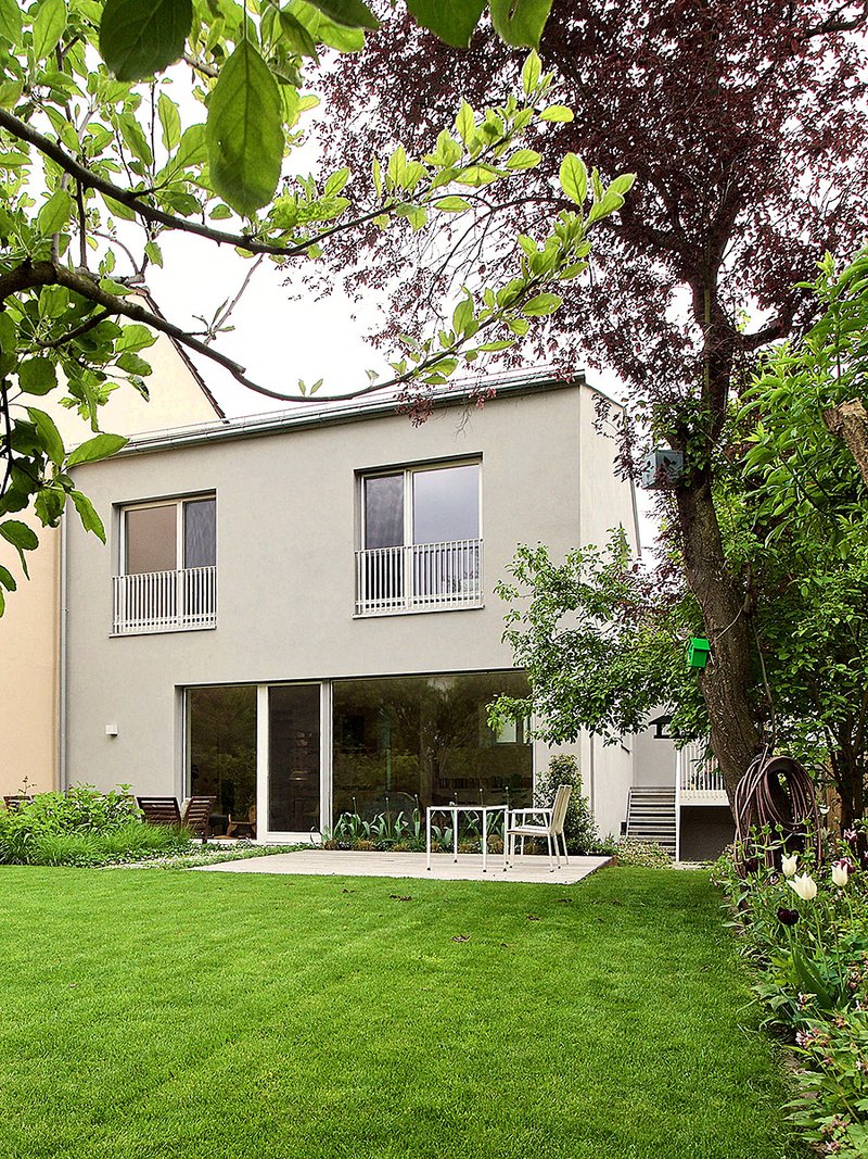 Das in die Jahre gekommene Wohnhaus aus den 1960ern sollte für eine vierköpfige Familie umgebaut und energetisch saniert werden. Der Charme und die Großzügigkeit des vorhandenen Gebäudes sollten wiederbelebt werden.Durch einen respektvollen Umgang mit der Substanz erfolgten nur wenig Abbruchmaßnahmen. So wurde der nur aufwendig zu sanierende Balkon im OG zu Gunsten der wärmedämmenden Hülle abgetrennt; einige Fensteröffnungen wurden vergrößert. Die kleine Einbauküche wurde dem großen Raum zugeschlagen und ermöglicht nun neue Sichtverbindungen über die Wohnebenen.Der Raumfluss der Split-Level-Ebenen wurde verstärkt, Sichtmauerwerk aus der Bauzeit aufgearbeitet und vorhandene Stahlkonstruktionen wurden mit neuen Füllungen und Belägen ausgestattet. Ein reduziertes Farbkonzept lässt die weißen Stahlkonstruktionen wie Brüstungen und den überdachten Eingangsbereich erstrahlen.Passend zum Innenraum wurde ein Außenraumkonzept entwickelt und umgesetzt. Der Vorgarten im Süden, zur Wohnstraße orientiert, erhielt einen sonnigen Sitzplatz für nachbarschaftliche Kontakte. Der rückseitige Garten im Norden setzt mit geometrisch im Rasen liegenden Beeten, Holzdeck, Plattenbelägen die Architektur im Außenbereich fort.