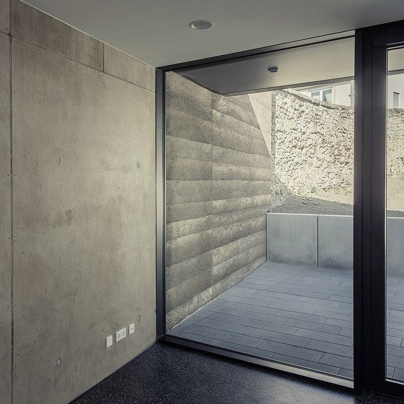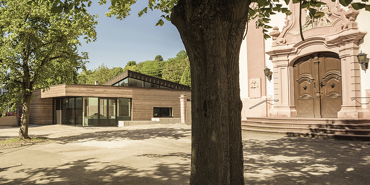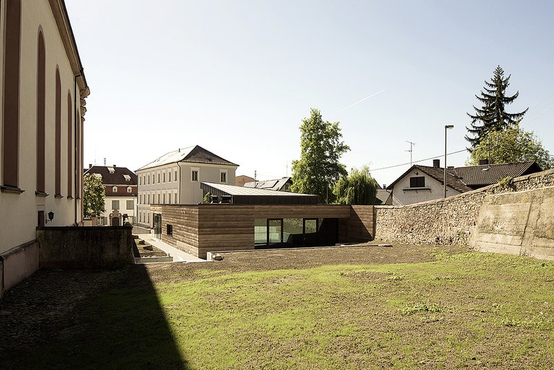 NeubauStädtebaulich ordnet sich das neue Gemeindehaus in das kräftige Thema der umschließenden Kirchhofmauer ein. Das eingeschossige Gebäude passt sich an das Gelände an und führt die Mauer fort. Die Fassade aus Stampfbeton lässt das Gemeindehaus wie eine Verlängerung der alten Mauer aussehen. Ebenso wie diese hat der Stampfbeton eine lebendige, natürliche Struktur, weist durch verschiedene Mischungen vielschichtige Farbtöne auf und wird in Lagen unterschiedlicher Höhe ausgeführt. So wird das Neue mit dem Alten verbunden.Im eingeschossigen Neubau befinden sich ein Gemeindesaal, ein Foyer und Nebenräume. Mit seinem einladenden Foyer öffnet sich der Neubau zum Kirchplatz, im rückwärtigen Bereich öffnet sich der neue Gemeindesaal zum Kirchgarten. Die Organisation des Gemeindehauses lässt vielseitige Nutzungen zu. So liegt z.B. die Küche am Saal sowie am Foyer und hat auch eine Ausgabe zum Kirchplatz. Für eine gleichmäßige Verteilung der natürlichen Belichtung im Saal sorgen die großen Oberlichter im Dachaufsatz. Die Innenraumgestaltung ist geprägt von hellen Wand- und Deckenflächen.