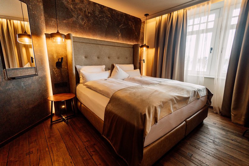 Der Erhalt von drei Kachelöfen und einiger Innentüren war ebenso Vorgabe des Denkmalschutzes. Diese wurden in die Innenausbauplanung und die Farbkonzeption der Zimmer integriert. Die individuelle Gestaltung der Hotel- und Badezimmer mit unterschiedlichen Material- und Farbkonzeptionen, individuell ausgewählten und angefertigten Möbeln verleiht jedem Hotelzimmer eine ganz eigene, besondere Atmosphäre.