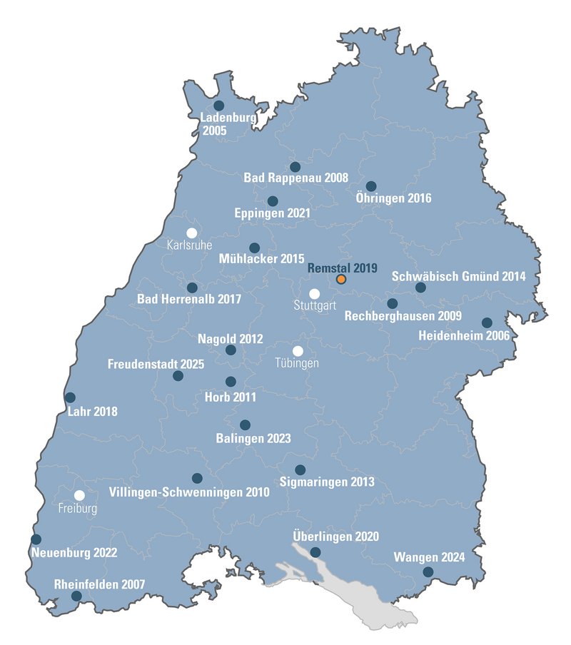 2021 Eppingen - Grünprojekt2022 Neuenburg - Landesgartenschau2023 Balingen - Grünprojekt2024 Wangen - Landesgartenschau2025 Freudenstadt / Baiersbronn - Grünprojekt