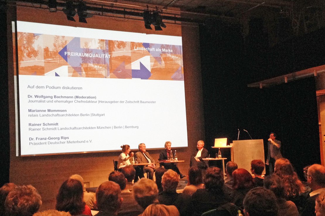Die diesjährige Runde auf dem Podium, die sich aus den renommierten Landschaftsarchitekten Marianne Mommsen (relais Landschaftsarchitekten, Berlin/ Stuttgart) bzw. Rainer Schmidt (Rainer Schmidt Landschaftsarchitekten, Berlin/ München/Bernburg) sowie Dr. Franz-Georg Rips, dem Präsidenten des Deutschen Mieterbundes, zusammensetzte, diskutierte Fragestellungen des Moderators Dr. Wolfgang Bachmann (Journalist, ehemaliger Chefredakteur des Baumeisters) zum Spektrum und zu den Schnittstellen von Landschafts-architekten und Architekten. Schnell zeigte sich anhand des Grünzuges Centro Verde, wie bedeutend eine enge Zusammenarbeit zwischen beiden Parteien ist, um einer Grünfläche im Zusammenspiel mit der umgebenden Bebauung das Potential zur Identitätsentwicklung eines Quartiers zu geben.