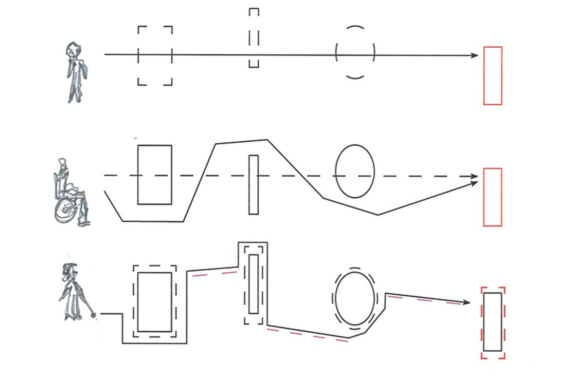 Mit dem Rollstuhl treten ganz andere Probleme auf. Hier steht meine Körperkraft im Mittelpunkt, mit der ich alle Hindernisse umfahren muss. Ich habe den Eindruck, dass Barrieren wie aus dem Nichts auftauchen. Augenscheinlich sieht der Bürgersteig eben aus, aber im Rollstuhl spüre ich jedes noch so schwache Quergefälle im ganzen Körper, denn es fällt mir schwer die Spur zu halten. Wasserrinnen mitten auf dem Platz, die mit Kopfsteinpflaster ausgelegt sind, werden zu einer regelrechten Falle. Die Reifen vom Rollstuhl drehen durch und ich verkante mich. Meine Kollegin muss mich befreien. Eine Bordsteinkante, die höher als drei Zentimeter ist, kann ich nicht überwinden, da ich Angst habe, vorne aus dem Rollstuhl zu kippen. Diese Kante wird für mich zu einer Barriere mit dem Ausmaß eines Abgrundes. Öffentliche Orte wie ein schickes Café in der Innenstadt sind plötzlich Räume, aus denen ich mich regelrecht ausgeschlossen fühle, weil dort eine Stufe von 12 cm zu überwinden ist. Ganz zu schweigen von den Sanitärräumen, die ich selbst dann nicht nutzen kann, wenn ich durch Zufall doch in ein Café gelange, denn sie sind mit Stufen vom Gastraum getrennt und keine einzige regelgerechte Bewegungsfläche ist im Bad eingehalten. Zwar habe ich jetzt mein Ziel immer klar vor Augen, aber ich muss mich auf umständlichen und beschwerlichen Umwegen dort hin begeben.