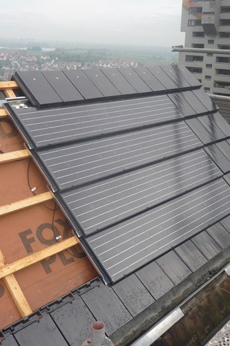 Das ist heute nicht mehr so, doch es zogen überwiegend Bewohner nach, die mit der Wohnidee des Hauses etwas anfangen konnten. Deshalb bestand auch eine Chance für das Projekt, das Haus nach 37 Lebensjahren mit einer Solaranlage baulich und energetisch weiterzuentwickeln.Die Eigentümer entschieden sich nach ausführlicher Diskussion im Sommer 2009 für eine breit angelegte Machbarkeitsstudie, in der die möglichen alternativen Lösungen solarer Energiegewinnung auf der obersten Ebene der unter 45° geneigten und ca. 55m langen Dachfläche der Südostseite abgeprüft werden sollten.Ein Jahr nach der ersten Befassung wurde der Eigentümerversammlung das Ergebnis vorgetragen. Eine solarthermische Ergänzung der Heizung und Warmwassererzeugung schied aus. Das Gebäude ist an eine Fernwärmeversorgung angeschlossen, beide Systeme sind schwer kompatibel, doch letztlich entscheidend war die bauliche Schwierigkeit der Führung der erforderlichen Rohrsysteme durch das komplexe Baugefüge und die gestalterische Unverträglichkeit der angebotenen Systeme. Bei der Fotovoltaik hingegen bietet der Markt inzwischen breiter gefächerte Elementbaukästen auch für unkonventionelle Lösungen, die auch bei denkmalgeschützten Gebäuden anwendbar sind.