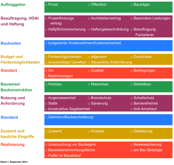 Zur Gliederung und Aufbau:10 Themen (linke Spalte) decken alle wichtigen Bereiche eines Bauvorhabens - von der Phase der Vorbereitung bis zur Phase der Realisierung - ab. Ergänzt werden diese durch weiterführende Stichpunkte in der rechten Spalte.