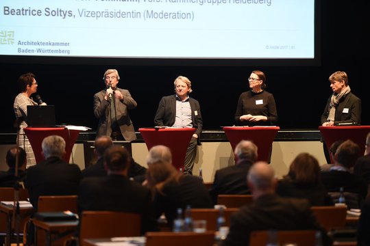 IBA RegionStuttgart, IBA Basel/Lörrach, IBA-Heidelberg: Drei unterschiedliche Strukturansätze für internationale Bauausstellungen stellten (v.l.) Thomas Bopp (mit Mikro), Architekt und Vorsitzender des Verband Region Stuttgart, der Sprecher der FÜNF Stuttgarter Kammergruppen Thomas Herrmann, Monika Neuhöfer-Avdic (Architektin, Fachbereichsleiterin Stadtentwicklung und Stadtplanung der Stadt Lörrach) sowie Jan van der Velden-Volkmann (Freier Architekt, Vorsitzender der Kammergruppe Heidelberg) vor. Vizepräsidentin Beatrice Soltys (l.) moderierte.