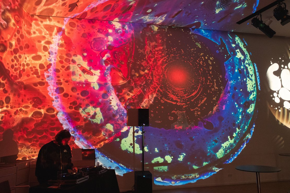 Nach der erlebten Verbindung von Wissenschaftstheorie und dem Drang diese in die gebaute Realität zu überführen, wurden digital erzeugte Klangweltendes AKBW Resident DJ Anton Aldin- ger mit analog erzeugten Bewegtbildern aus der Echtzeitmanufaktur von Phoenix Retro Light vereint. Vertrauend auf die eigene Professionalität, lief der Aufbau der Musikanlage und auch der Bilderwerkstatt wie ein Schweizer Uhrwerk. Diesem Anspruch gerecht werdend, blendeten die Bilder über das Gehörte und machten dies zu einem multisensoriellen Erlebnis, bei dem es schwer fiel unbewegt zu bleiben.