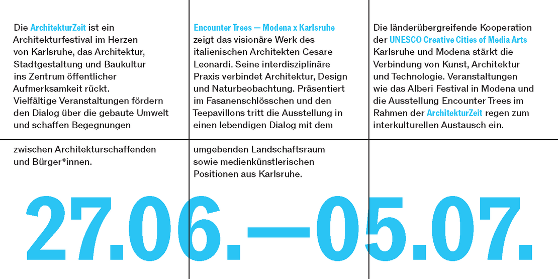 Eröffnet wird das Festival am 27. Juni zusammen mit der Ausstellung „Encounter Trees – Modena x Karlsruhe“ beim Fasanenschlösschen. Dorthin führt ab dem Marktplatz ein gemeinsamer Spaziergang. Bis 5. Juli wird mit Stroh gebaut und mit Solarfotographie experimentiert. Es gibt Fotografien von Menschen in der Stadt, Modelle und „Das essbare Unsichtbare“ an Plakatsäulen zu sehen. Leerstand und Potenziale werden am Tag der Architektur per Rad erkundet, junge Architekturschaffende richten dem Gestaltungsbeirat „Schöne Grüße“ aus. Die Vorträge von AFF-Architekten und Regine Leibinger, Sascha Bauer und Prof. de Rudder sowie den „Neuen“ im BDA sind teilweise als Fortbildung anerkannt. Und immer bleibt Zeit für Gespräche, Fragen und Diskussionen, so auch nach Vortrag und Film zu den Farben von Eileen Gray im Rahmen des WIA-Festivals in der Kinemathek oder an der Bar im Nymphengarten, die zum Tag der Architektur aus Bauteilen des ehemaligen Pavillons von 2001 aufgebaut wird.