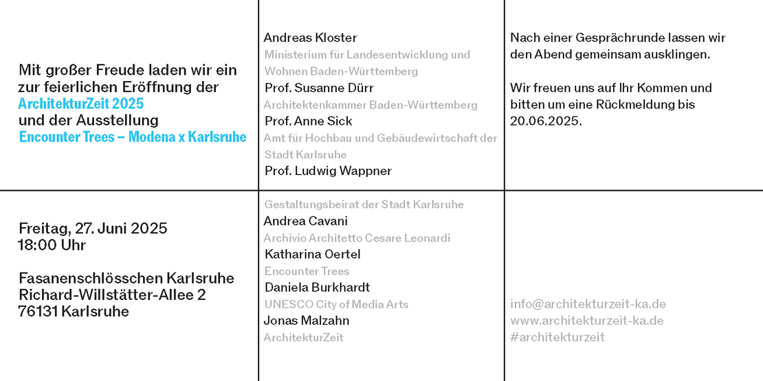 Dank Förderungen durch das Ministerium für Landesentwicklung und Wohnen Baden-Württemberg und der Schwäbisch-Hall-Stiftung sowie der Unterstützung von feco, optiplan, KT.Color, D+S, Thost und der Sparkasse Karlsruhe erhalten Bürgerinnen und Bürger neun Tage lang die Möglichkeit an vielen Orten in der Stadt mit Fachleuten in Austausch zu treten und bekommen Einblicke in Lehre und Forschung, Planung und Umsetzung. Weitere Informationen sind unter www.architekturzeit-ka.de und auf Instagram #architekturzeit zu finden.