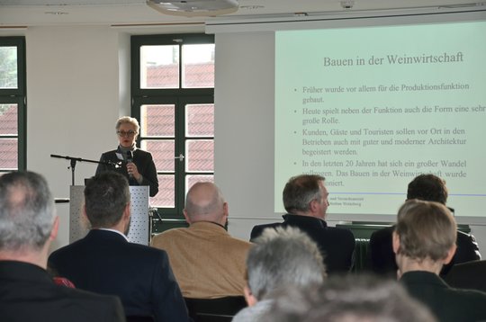Es gehe beim Bauen nicht nur um funktionales Denken, „sondern um Nachdenken darüber, was wir wirklich brauchen“. Deshalb gebe Baukultur einen Impuls, wie der Raum wieder in den Nutzen genommen wird“. Durch die Prägung des Kraichgaus mit Weinanbau erhoffen sich Architektenkammer und Regierungspräsidium, dass sich beispielsweise Bauherren aus diesem Bereich an dem Verfahren beteiligen. Dass Baukultur und Wein eine reizvolle Kombination sein kann, zeigten die Beispiele aus Italien oder Frankreich, die Carmen Mundorff von der Architektenkammer Baden-Württemberg mitgebracht hatte. Eines der wesentlichen Grundprinzipien sei das „Bauen mit der Landschaft“, so dass sich die zum Teil großen Bauten sehr gut einfügten. Eine gute Architektur sei die Visitenkarte des Winzers, betonte Mundorff. Bei der Auftaktkonferenz waren auch Vertreter eines Positivbeispiels eingeladen.