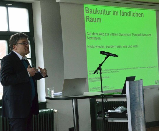 Im Fachvortrag betonte Mark Michaeli, Professor am Lehrstuhl für Nachhaltige Entwicklung von Stadt und Land an der TU München, Baukultur sei ein Weg zu einer „wirklich vitalen Gemeinde“. Es gehe beim Bauen nicht nur um funktionales Denken, „sondern um Nachdenken darüber, was wir wirklich brauchen“. Deshalb gebe Baukultur einen Impuls, wie der Raum wieder in den Nutzen genommen wird“. Durch die Prägung des Kraichgaus mit Weinanbau erhoffen sich Architektenkammer und Regierungspräsidium, dass sich beispielsweise Bauherren aus diesem Bereich an dem Verfahren beteiligen.