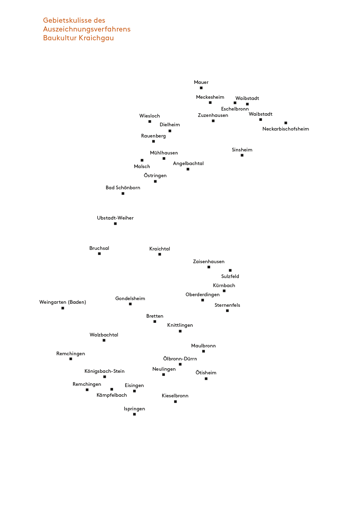 Der Kraichgau ist durch historisch bedeutsame, gewachsene Ortsbilder mit vielgestaltigem Gebäudebestand in einer besonders durch den Weinbau geformten Kulturlandschaft geprägt. Eine die lokaltypischen Strukturen in den Gemeinden und Kulturlandschaften der Region erhaltende und entwickelnde Planungs- und Baukultur leistet einen wichtigen Beitrag zu einer erfolgreichen Entwicklung als attraktiver Wohn- und Wirtschaftsstandort.Die Architektenkammer Baden-Württemberg, Kammerbezirk Karlsruhe / Nordbaden, das Regierungspräsidium Karlsruhe und das Ministerium für Wirtschaft, Arbeit und Wohnungsbau Baden-Württemberg haben darum „Baukultur Kraichgau“ als gemeinsam getragenes Projekt im Rahmen der Landesinitiative Baukultur Baden-Württemberg gestartet.Mit dem Auszeichnungsverfahren 2018 sollen beispielgebende Projekte sowie Konzepte und Planungen in den Gemeinden aufgespürt, Projektbeteiligte für ihr Engagement gewürdigt und die ausgezeichneten Projekte bzw. Konzepte einer breiten Öffentlichkeit bekannt gemacht werden. Dabei soll der Blick besonders auf die ortstypischen Bautraditionen und -materialien gelenkt und Wege für deren zeitgemäße Interpretation und Fortführung aufgezeigt werden. Die Veranstalter wollen damit das Bewusstsein für den Stellenwert qualitätsvollen Planens und Bauens im Alltag schärfen, anhand beispielhafter Projekte und innovativer Konzepte Anregungen für die Praxis geben und dazu ermutigen, baukulturell hochwertige Lösungen anzustreben. Für die Auszeichnung Baukultur Kraichgau gelten folgende Kriterien: • standorttypische Lösungen in zeitgemäßer Architektur für Landschaft und Siedlungsstruktur• funktionsbegründete Gestaltung nach heutigen Nutzungsbedingungen• energie- und ressourcenbewusste, flächen- und kostensparende Konzepte und Ausführungen• Beachtung regionaltypischer Materialien und Handwerkstraditionen• Einsatz innovativer und intelligenter Techniken• Schaffung eines förderlichen Umfeldes für ein soziales Miteinander und kulturelles LebenDie Gebietskulisse des Auszeichnungsverfahrens ist oben aus der Karte ersichtlich.