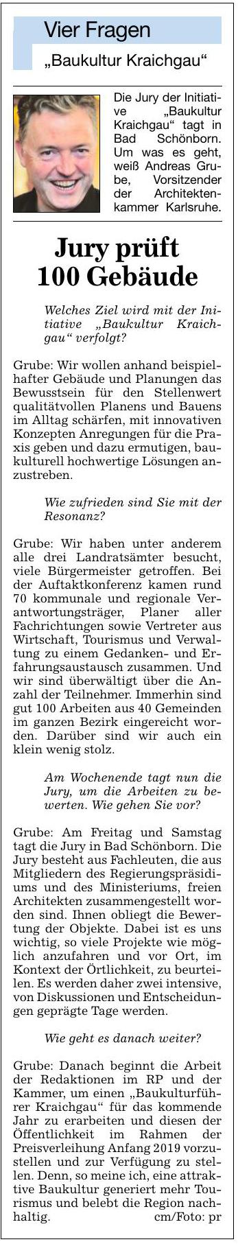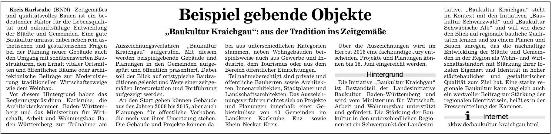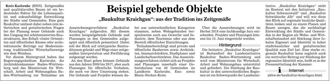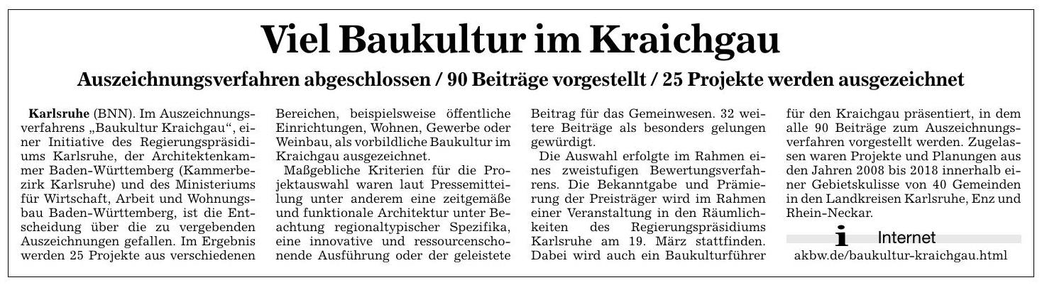Badische Neueste Nachrichten / Aus der Region / 18.09.2018Vier Fragen - Baukultur Kraichgau - "Jury prüft 100 Gebäude!Artikel zum Herunterladen (Ausschnitt)Die Veröffentlichung des Artikels erfolgt mit freundlicher Genehmigung der BNN Karlsruhe.