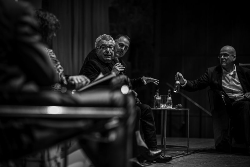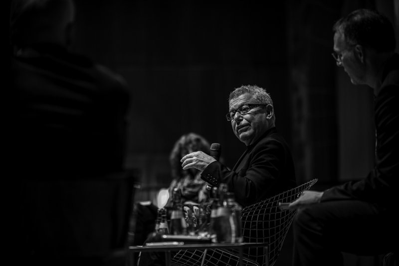 Im anschließenden Podiumsgespräch mit der Ausstellungskuratorin Kristin Feireiss, Kaye Geipel von der Bauwelt und Moderator Reinhard Hübsch konnte Libeskind seine Standpunkte zum Arbeiten im historischen Kontext noch weiter präzisieren. Für ihn sei Tradition nicht der liebe Hund, den man zähmen könne; im Gegenteil, Tradition und Geschichte seien teilweise gewalttätig und Nostalgie als Selbstzweck funktioniere nicht in der Architektur. Auf die Frage, wie man Erinnerungen in Architektur umsetzen könne, meinte Libeskind, man müsse sich auf das Experiment der Erinnerung als physische Erfahrung und als zentrales Element der Architektur einlassen. Sie sei die Verbindung zu einer nonverbalen Sprache – Rezepte zur Umsetzung könne er aber keine geben. Problematisch sei allerdings die Verlagerung der Erinnerungen in eine virtuelle Welt, was dazu führe, dass heutzutage geschichtslose Städte gebaut würden.