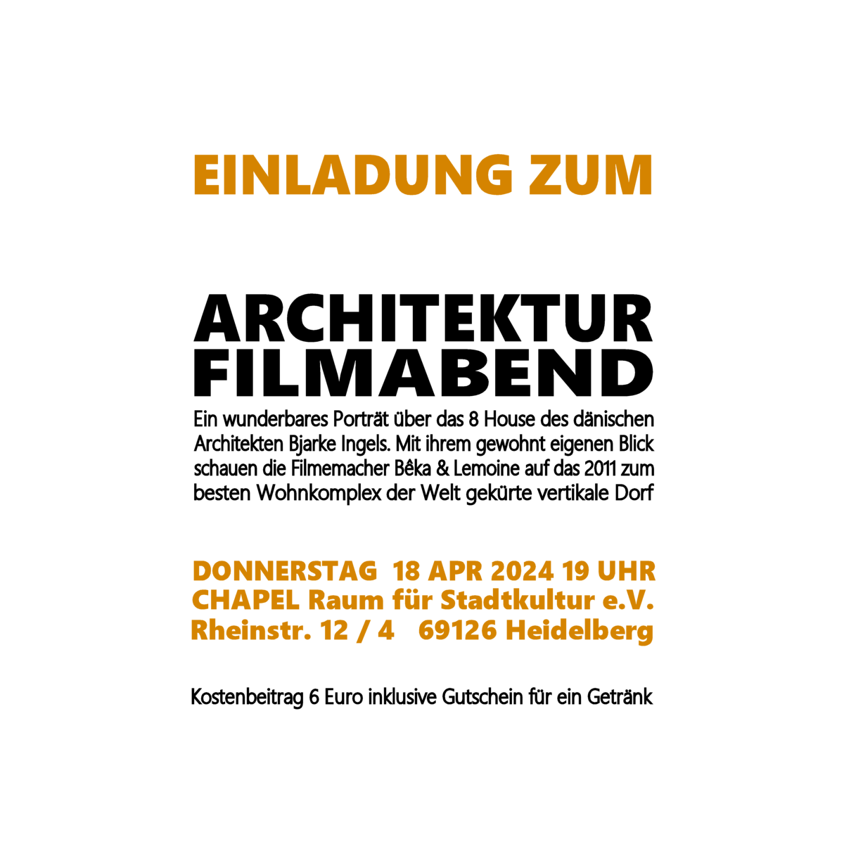 Liebe Mitglieder, formAD e.V. und die Architektenkammer Baden-Württemberg, Kammergruppe Heidelberg, laden alle Architektur- und Designinteressierte zum vierten Architekturfilmabend in der Chapel in Heidelberg ein. In dem Film "The Infinite Happiness" schauen sich die mehrfach preisgekrönten Filmemacher Ila Bêka und Louise Lemoine mit ihrem gewohnt eigenen Blick das "8 House" der dänischen Bjarke Ingels Group an. Das 2009 am Stadtrand von Kopenhagen errichtete "vertikale Dorf" mit insgesamt 476 Wohnungen wurde 2011 zum besten Wohnkomplex der Welt gekürt. In 30 kurzen Episoden teilen die Zuschauer die Erfahrungen der im, vom und mit dem 8 House lebenden Menschen und lernen die Qualität dieses innovativens Bauwerks kennen, das auch als soziales Kraftwerk verstanden werden darf.Eintritt 6 Euro inkl. Getränkegutschein Donnerstag, 18.04.2024 um 19 Uhr Chapel e.V. - Raum für Stadtkultur Rheinstraße 12/4 69126 Heidelberg Mit freundlichen Grüßen Robert Schmidt hsa herbstrieth.schmidt.architekten Partnerschaft mbB nils herbstrieth robert m.k. schmidt freie architekten diplom-ingenieure fh hochbau städtebau feuerbachstraße 5 69126 heidelberg fon 06221-636702 fax 06221-636700schmidt spamgeschützt @ spamgeschützt hsarchitekten.dewww.hsarchitekten.de