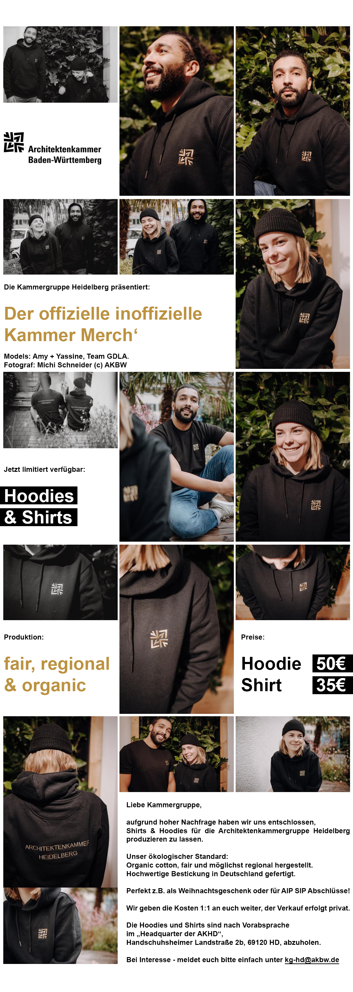 aufgrund hoher Nachfrage haben wir uns entschlossen, Shirts & Hoodies für die Architektenkammergruppe Heidelberg produzieren zu lassen. Unser ökologischer Standard: Organic cotton, fair und möglichst regional hergestellt. Hochwertige Bestickung in Deutschland gefertigt. Perfekt z.B. als Weihnachtsgeschenk oder für AIP SIP Abschlüsse! Wir geben die Kosten 1:1 an euch weiter, der Verkauf erfolgt privat. Die Hoodies und Shirts sind nach Vorabsprache im „Headquarter der AKHD“, Handschuhsheimer Landstraße 2b, 69120 HD, abzuholen. Bei Interesse - meldet euch bitte einfach unter kg-hd spamgeschützt @ spamgeschützt akbw.de Daniel Lindemann Kammergruppe Heidelberg 1. VorsitzenderAngebot zum Herunterladen