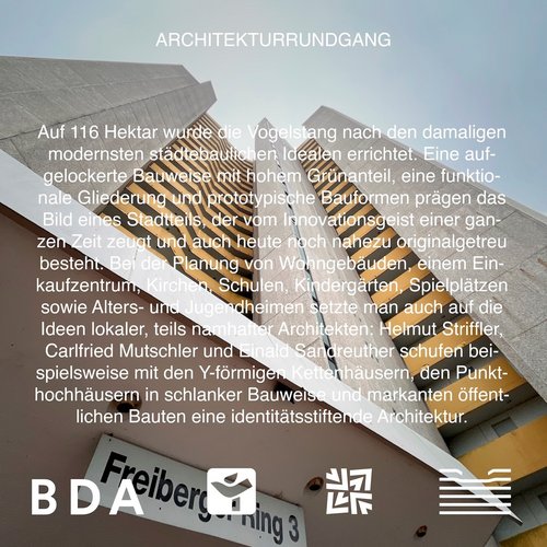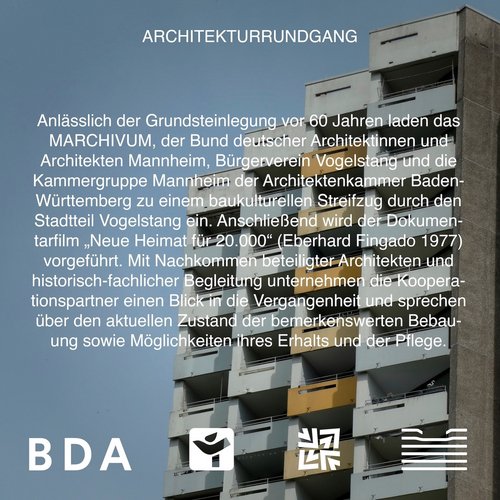 VOGELSTANG UND SEINE BAUTEN Kostenfreier Architekturrundgang, Filmvorführung und Gesprächsrunde mit - Dr. Andreas Schenk (Stadtbauschreiber MARCHIVUM) - Johannes Striffler (Architekt BDA) - Dennis Ewert (Architekt, Vorsitz AKBW MA) Do. 12. September 2024, 17:30 Uhr (Dauer ca. 2,5 Stunden) Treffpunkt: Freizeitstätte Bürgerverein Vogelstang, Freiberger Ring 12 (Vogelstang-Center) Kooperationsveranstaltung MARCHIVUM, Bund deutscher Architektinnen und Architekten Mannheim, Bürgerverein Vogelstang & Kammergruppe Mannheim der Architektenkammer Baden-Württemberg. Eine Anmeldung ist nicht erforderlich. Fortbildungspunkte sind beantragt. Anlässlich der Grundsteinlegung vor 60 Jahren laden das MARCHIVUM, der Bund deutscher Architektinnen und Architekten Mannheim, Bürgerverein Vogelstang und die Kammergruppe Mannheim der Architektenkammer Baden-Württemberg zu einem baukulturellen Streifzug durch den Stadtteil Vogelstang ein. Anschließend wird der Dokumentarfilm "Neue Heimat für 20.000" von Eberhard Fingado aus dem Jahr 1977 vorgeführt. Mit Nachkommen beteiligter Architekten und historisch-fachlicher Begleitung unternehmen die Kooperationspartner einen Blick in die Vergangenheit und sprechen über den aktuellen Zustand der bemerkenswerten Bebauung sowie Möglichkeiten ihres Erhalts und der Pflege „Bei uns können Sie eine Stadt bestellen“ war einst Slogan und Programm des gewerkschaftseigenen Wohnungsbauunternehmens „Neue Heimat“. In Mannheim hatte ihre Tochtergesellschaft GEWOG gemeinsam mit anderen lokalen gemeinnützigen Trägern den Auftrag erhalten, den neuen Stadtteil „Vogelstang“ für über 20.000 Menschen zu erstellen, um die Wohnungsnot der Nachkriegszeit zu lindern. In einer Rekordzeit von fünf Jahren nach der Grundsteinlegung am 10. September 1964 waren bereits über 5.000 Wohneinheiten fertiggestellt. Heute wohnen 12.495 Menschen auf der Vogelstang und damit nennen 3,8% der Mannheimer Bevölkerung diesen Stadtteil ihr Zuhause. Auf 116 Hektar wurde die Vogelstang nach den damaligen modernsten städtebaulichen Idealen errichtet. Eine aufgelockerte Bauweise mit hohem Grünanteil, eine funktionale Gliederung und prototypische Bauformen prägen das Bild eines Stadtteils, der vom Innovationsgeist einer ganzen Zeit zeugt und auch heute noch nahezu originalgetreu besteht. Bei der Planung von Wohngebäuden, einem Einkaufzentrum, Kirchen, Schulen, Kindergärten, Spielplätzen sowie Alters- und Jugendheimen setzte man auch auf die Ideen lokaler, teils namhafter Architekten: Helmut Striffler, Carlfried Mutschler und Einald Sandreuther schufen beispielsweise mit den Y-förmigen Kettenhäusern, den Punkthochhäusern in schlanker Bauweise und markanten öffentlichen Bauten eine identitätsstiftende Architektur.