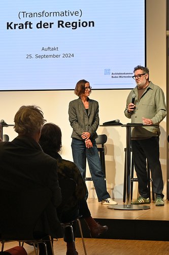 Die Begrüßung übernahmen Markus Weismann und Dr. Christine Baumgärtner, die beide die Bedeutung der Region für Architektur, Wirtschaft und Gesellschaft betonten. Markus Weismann hob hervor, dass der Kammerbezirk Stuttgart als größter der Architektenkammer Baden-Württemberg eine zentrale Rolle im anstehenden Strukturwandel einnehmen wolle. Er unterstrich die Bedeutung der Region, gerade wenn es um übergreifende Themen wie zirkuläres Bauen und Hochwasserschutz geht. Weismann forderte ein Umdenken, bei dem Planende über einzelne Quartiere hinaus denken und die Region als Gesamtes in den Blick nehmen. Christine Baumgärtner pflichtete dem bei und fügte hinzu, dass durch die enge Zusammenarbeit von Kommunen Synergien entstehen können, die das Potenzial für Transformation und Wandel enorm steigern. Sie forderte eindringlich zum Handeln auf und warnte davor, weiter auf ideale Rahmenbedingungen zu warten. „Wir müssen ins Handeln kommen“, betonte sie und rief dazu auf, die Transformation mutig und regional zu denken.