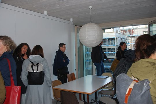 Die Idee ist ein neues Veranstaltungsformat, bei dem sich einzelne Büros mit ihren Projekten vorstellen – und das nicht in einem beliebigen Seminarraum, sondern in den Büroräumen der Referierenden selbst. Die Frauen der Kammergruppe Freiburg praktizieren diese Form des Informationsaustauschs schon seit Jahren erfolgreich. Ein hervorragendes Konzept, das das Netzwerken sowie den Austausch von unterschiedlichsten Fragestellungen und Informationen befördert. Die erste Veranstaltung dieser Art in der Kammergruppe Stuttgart-West/Mitte fand im Mai dieses Jahres statt: Das Büro „Architekturagentur“ erläuterte nicht nur sein Schwerpunktthema „Holzbau“, sondern konnte auch ein gerade fertiggestelltes Objekt in fußläufiger Entfernung präsentieren: das Baugemeinschaftsprojekt „Max8“ auf dem „Olga-Areal“. Die stellvertretende Kammergruppenvorsitzende Sonja Schmucker, gleichzeitig Bauherrin in der Baugemeinschaft, war vor Ort und konnte den Kammergruppenmitgliedern, die dieses Mal mit großem Interesse der Einladung gefolgt waren, somit Tür und Tor öffnen.