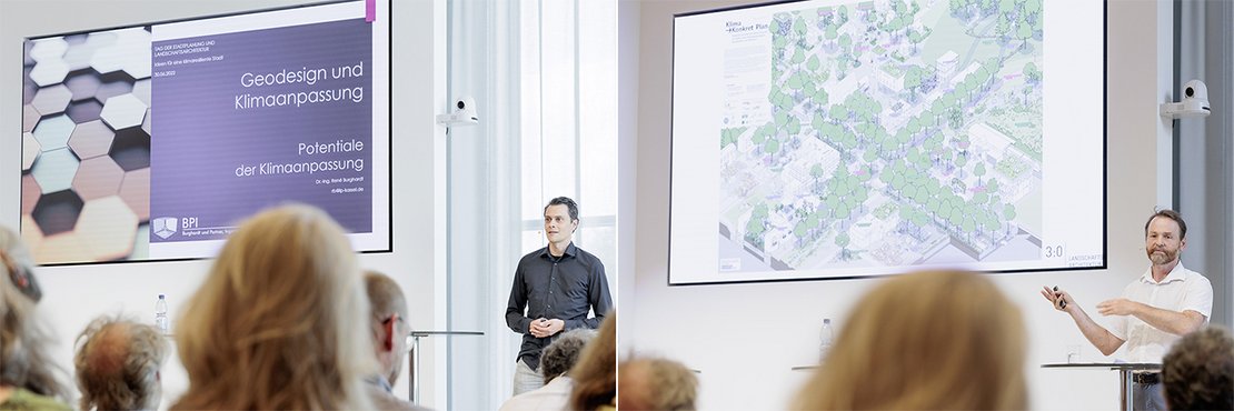 Dr. René Burghardt von der Uni Kassel, Experte für Geodesign und Klimaanpassung, erachtet das Erkennen lokaler Potenziale und Defizite für wichtig. Denn jeder Raum, jeder Ort sei individuell und müsse dem Klima entsprechend angepasst werden. Dafür seien Daten wichtig, um den Raum besser analysieren und interpretieren zu können und damit beispielsweise Hotspots, Coolspots oder Frischluftschneisen zu erkennen. Das Thema Klimaanpassung stehe meist viel zu spät auf der Agenda – klimatische Steckbriefe sollten schon im städtebaulichen Wettbewerb berücksichtigt werden. „Aspekte des Klimas und der Klimaanpassung eröffnen das Potenzial um Raum, Zeit, Funktion, Nutzung zukunftsgerecht miteinander zu verknüpfen“, so Burghardt. „Berücksichtigung des Klimas ist nicht das fünfte Rad am Wagen. Wir benehmen uns wie kleine verwöhnte Kinder, die sagen: ‚Klimaschutz, muss das jetzt auch noch sein!‘“