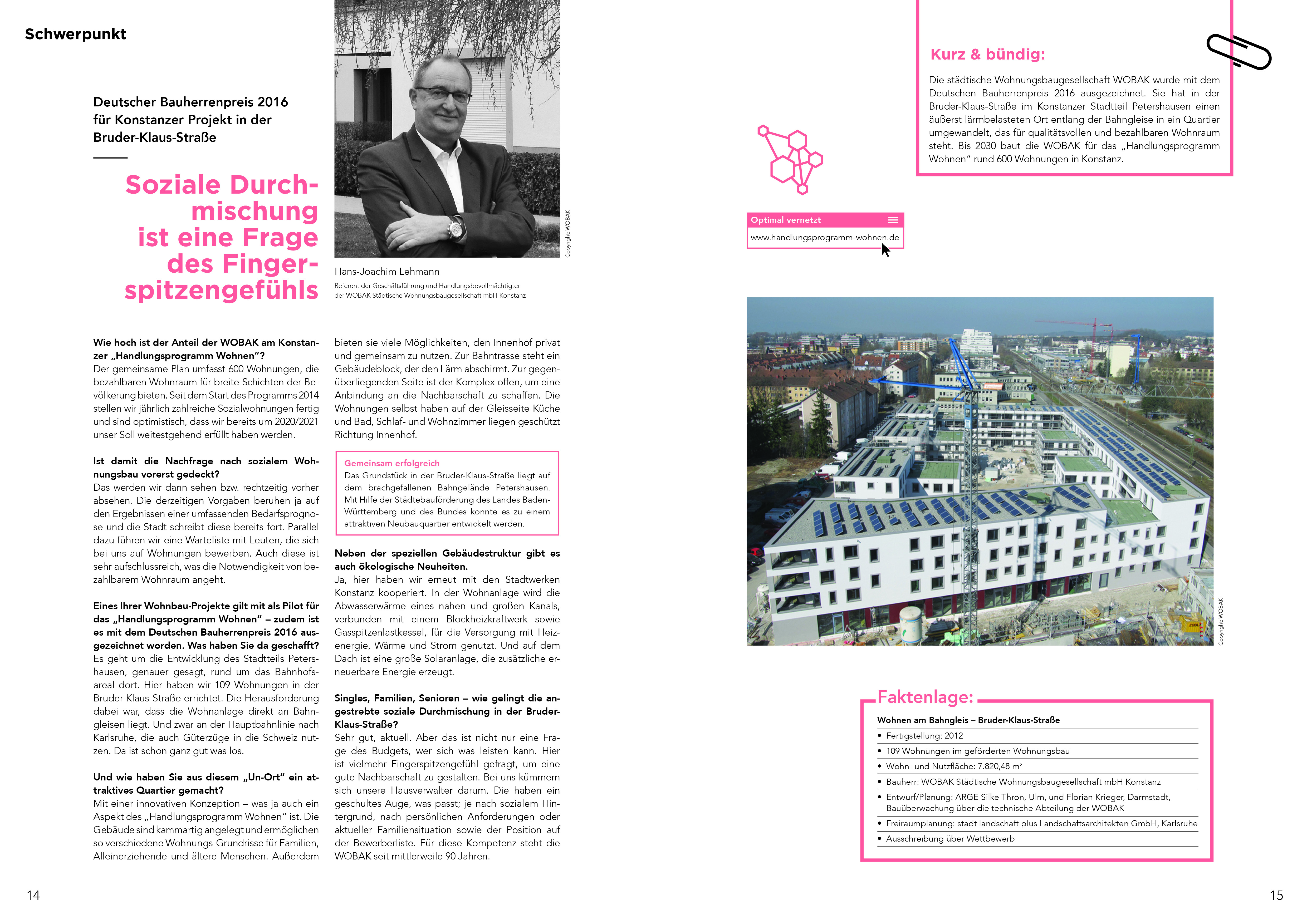 "Wir sind ein Innovationsland, das muss sich auch in unserem Umgang mit gegenwärtigen und zukünftigen Wohnformen zeigen", fordert Markus Müller. Dabei setzt er nicht nur auf die Darstellung aktueller Probleme, sondern auf den Diskurs. In den Arbeitsheften kommen Bürgermeister und Bewohner genauso zu Wort wie Architekten und weitere Projektverantwortliche. Darüber hinaus nehmen überregional bekannte Experten Stellung zu den jeweiligen Schwerpunkten der Ausgaben.