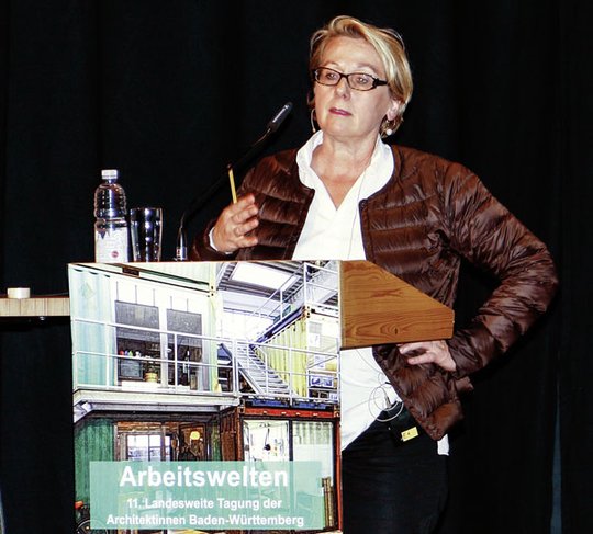 Nach der Begrüßung der über 160 Teilnehmerinnen, Aussteller und Sponsoren durch Barbara Friedrich, Vertreterin des Arbeitskreises Architektinnen in der Kammer, übernahmen Prof. Dr. Anke Karmann-Woessner, Leiterin Stadtplanungsamt Karlsruhe, und Eva Schlechtendahl, Vizepräsidentin der AKBW, die Grußworte. Als Moderatorin führte Dr. Barbara Leichtle versiert durch das Thema des Tages. Dr. Anne-Sophie Tombeil, Fraunhofer IAO, beschrieb die Trends und Zukunftsszenarien der sich verändernden Arbeitswelten, die auf Städtebau und Architektur entscheidenden Einfluss haben werden. Themen ihrer Forschungen, die sie spannend zu vermitteln wusste, waren u.a. die Digitalisierung der Arbeit - z.B. das Büro wird mobil, der soziokulturelle Wandel, Gestaltung von Komplexität und die Dienstleistung als Unternehmenslogik. Frau Dr. Tombeil ermutigte uns Planerinnen, sich in diese spannenden Herausforderungen einzumischen und mit zu gestalten
